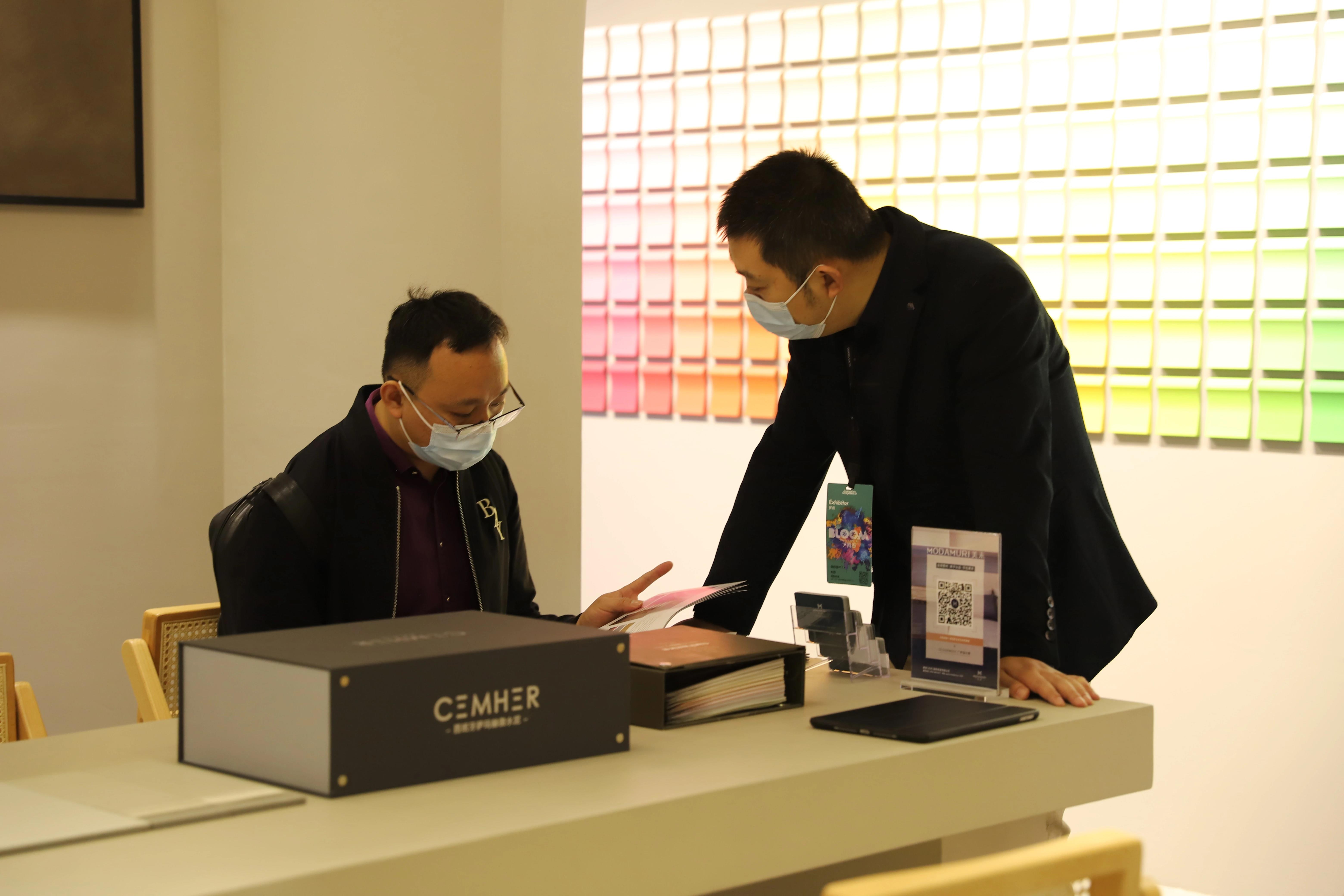展厅中,350个比利时玛诗漆色彩样板汇成的色彩墙,与西班牙萨玛赫微水泥、意大利圣乔治火山泥、意大利Stucco Italiano艺术漆打造的质感丰富材质样板,让观众从更多维视角感受品牌魅力。